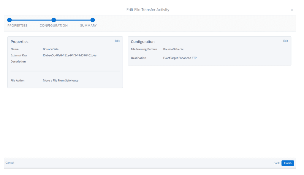 - To transfer data from the Safehouse to an FTP location, use the File Transfer Activity. Choose the Move a File from Safehouse option to initiate the transfer from Marketing Cloud’s secure file transfer location to your designated FTP spot.
