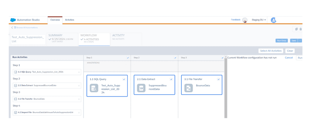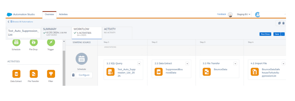 Here’s a step-by-step guide for implementing an automated auto-suppression list within Salesforce Marketing Cloud.